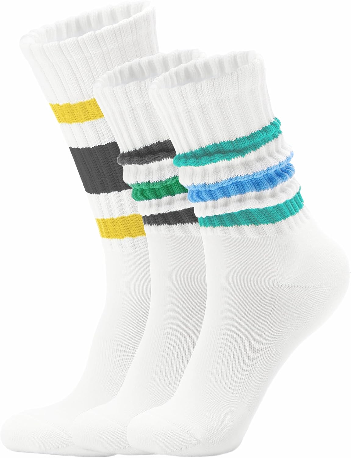 Retro Striped Slouchy Crew Socks for Men & Women 3 Pairs Cotton Athletic Tube Cushioned Calf Tennis Socks Size 5–11