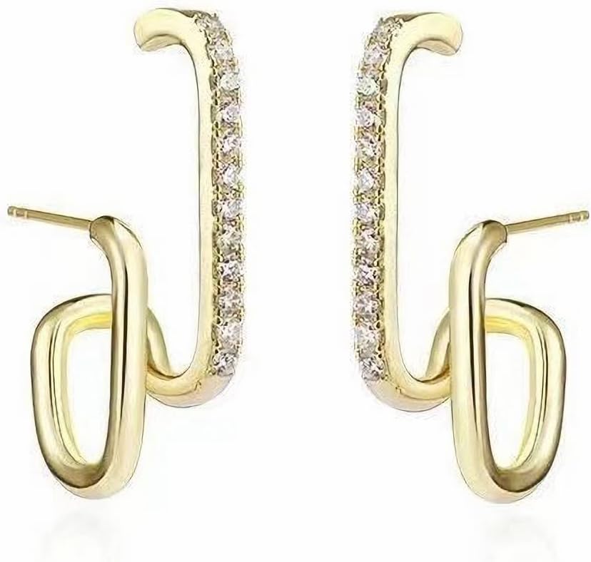 Women's 14K Gold Plated Double Twist Hoop Earrings Double Row Simulated Diamonds Illusion Ear Stud Split Huggie Earrings That Look Like Multiple Piercings Stud Earrings