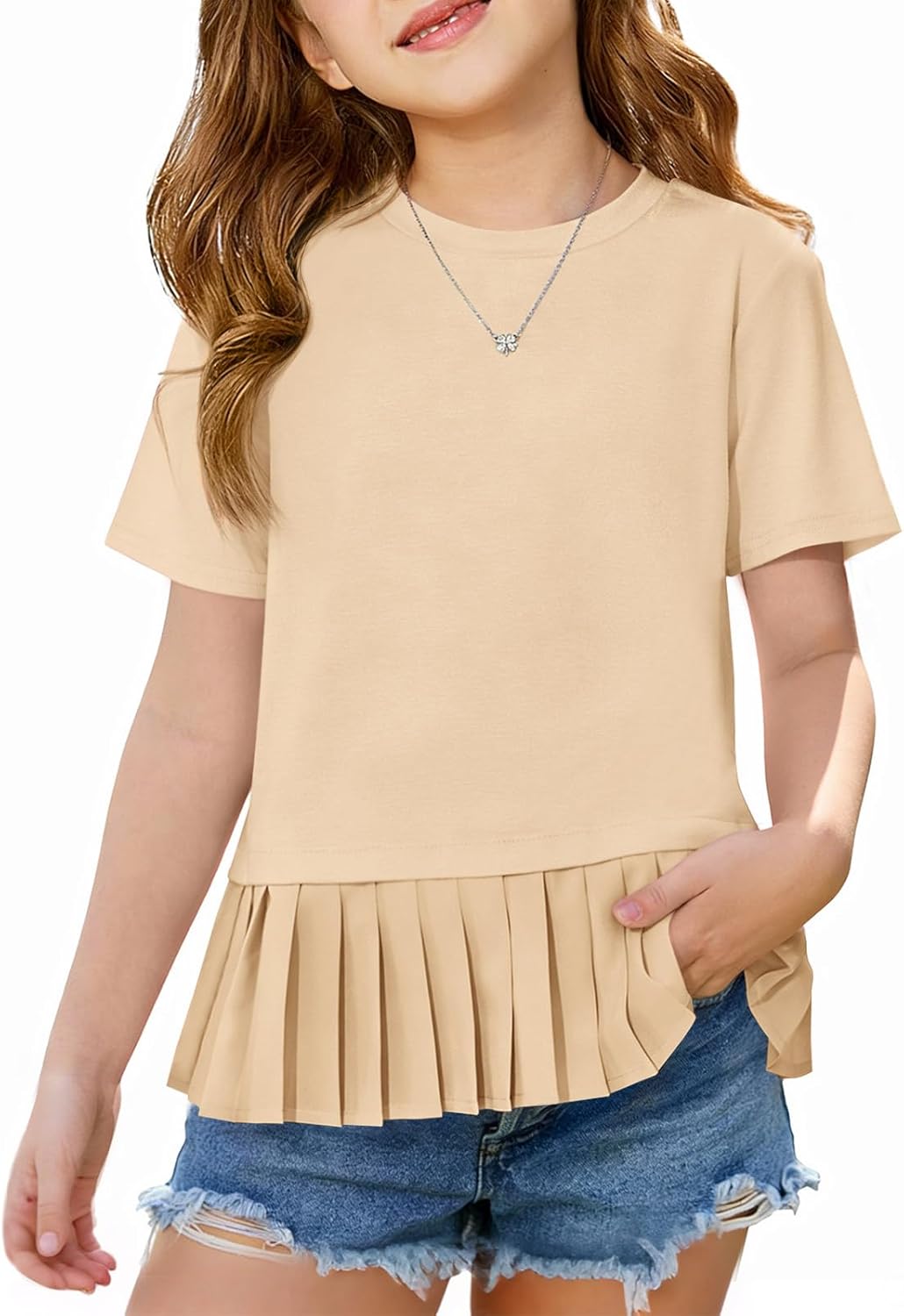 Haloumoning Girls Short Sleeve Shirts Kids Cute Pleated Hem T-Shirts Summer Fashion Tops Tees 5-14 Years