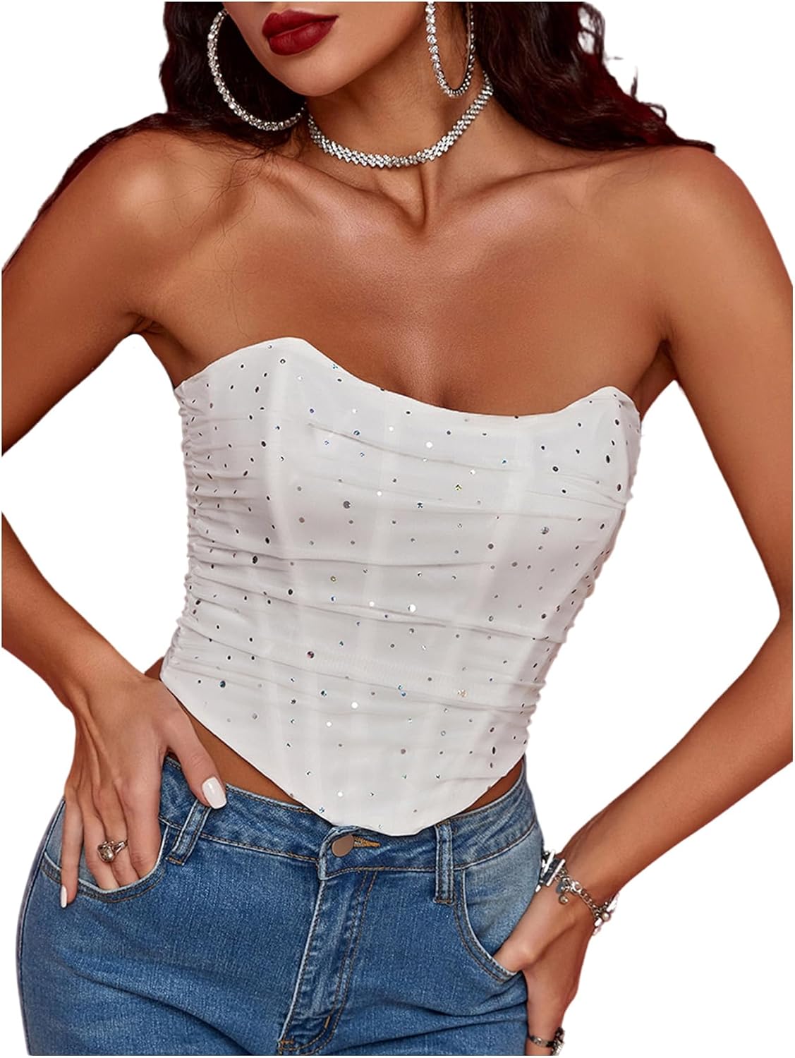 MakeMeChic Women's Sequin Strapless Corset Top Shapewear Sparkly Bustier Ruched Lace Up Party Crop Y2K Tops