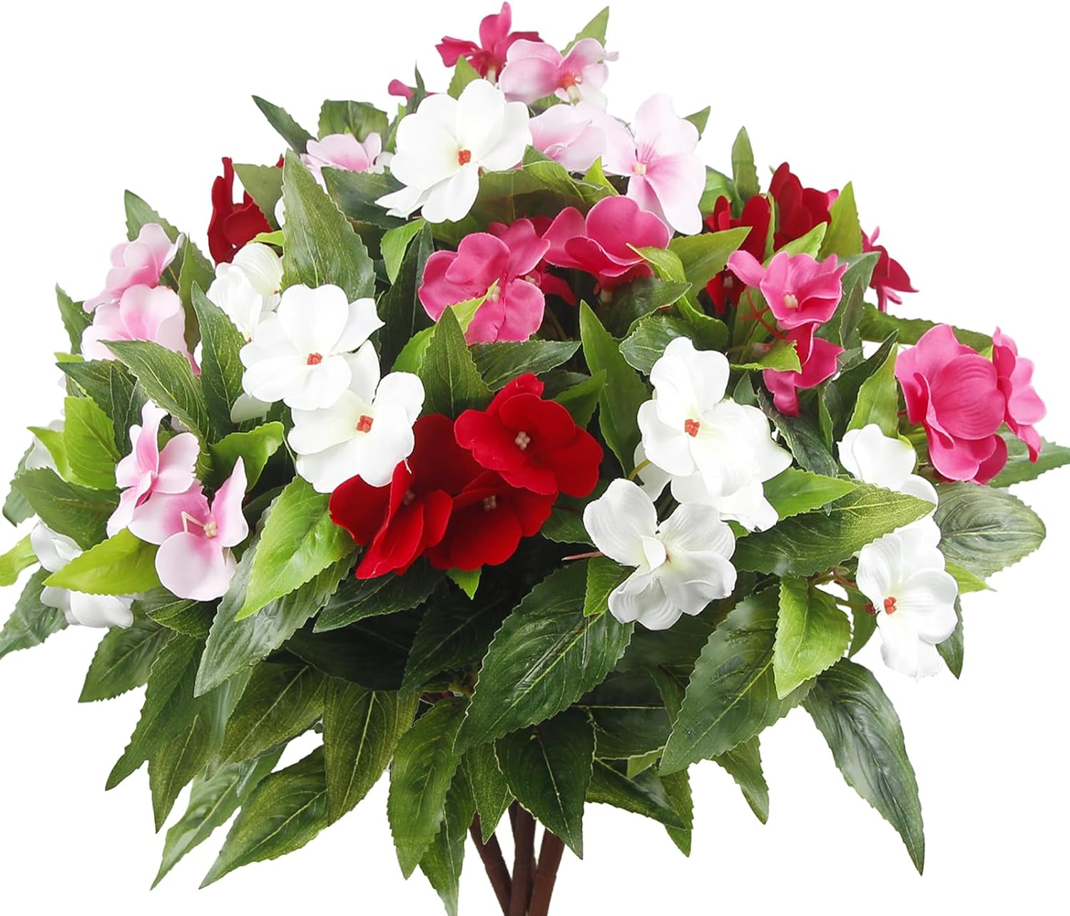 - Realistic & UV Resistant: 4 pcs artificial impatiens looks just like real impatiens, the flowers are made of velvet full of fleece, soft to the touch, lifelike shape, the stems and leaves are made of high-quality plastic, they don't need to be watered water while also resisting sun damage.