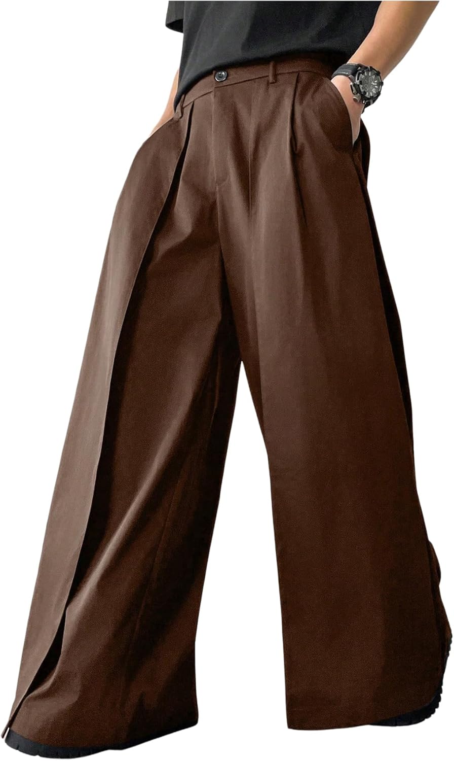 OYOANGLE Men's Baggy Wide Leg Pants Zipper Fly Pleated Trousers Business Casual Dress Pants with Pocket