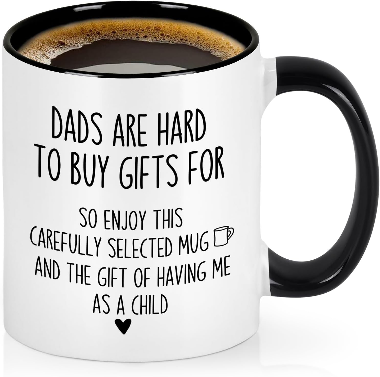 - BEST GIFTS FOR DAD: It's a common truth to admit that buying a gift for dad is notoriously tricky. The dad gift says it all. It features the wisecracking text, " DADS ARE HARD TO BUY GIFTS FOR, SO ENJOY THIS CAREFULLY SELECTED MUG AND THE GIFT OF HAVING ME AS A CHILD" . The dad Christmas gift makes fun of the difficulty of buying dad gift while celebrating the ultimate gift - you!