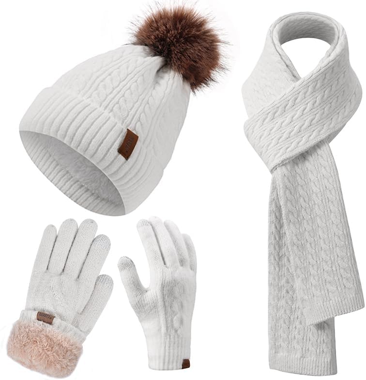 Winter Hat Scarf Gloves Set for Women, Classic Cable Beanie with Removable Pom Pom Long Scarf Touchscreen Gloves 3 in 1 Set