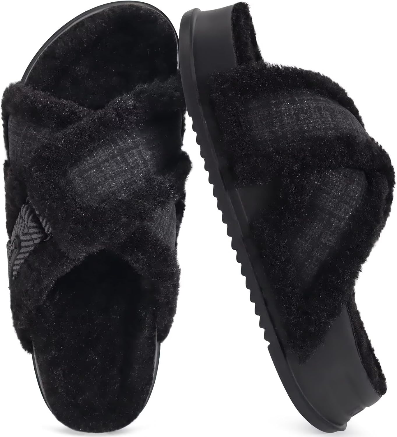 KuaiLu Women's Fuzzy Cross Band Platform Slippers Furry Faux Fur Comfortable Arch Support Open Toe Slides for Indoor Outdoor