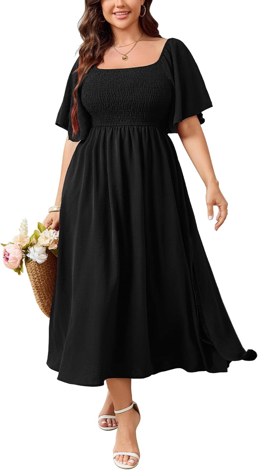 Women's Plus Size Dress Short Sleeve Square Neck Smocked Side Split Flowy A Line Long Maxi Dress