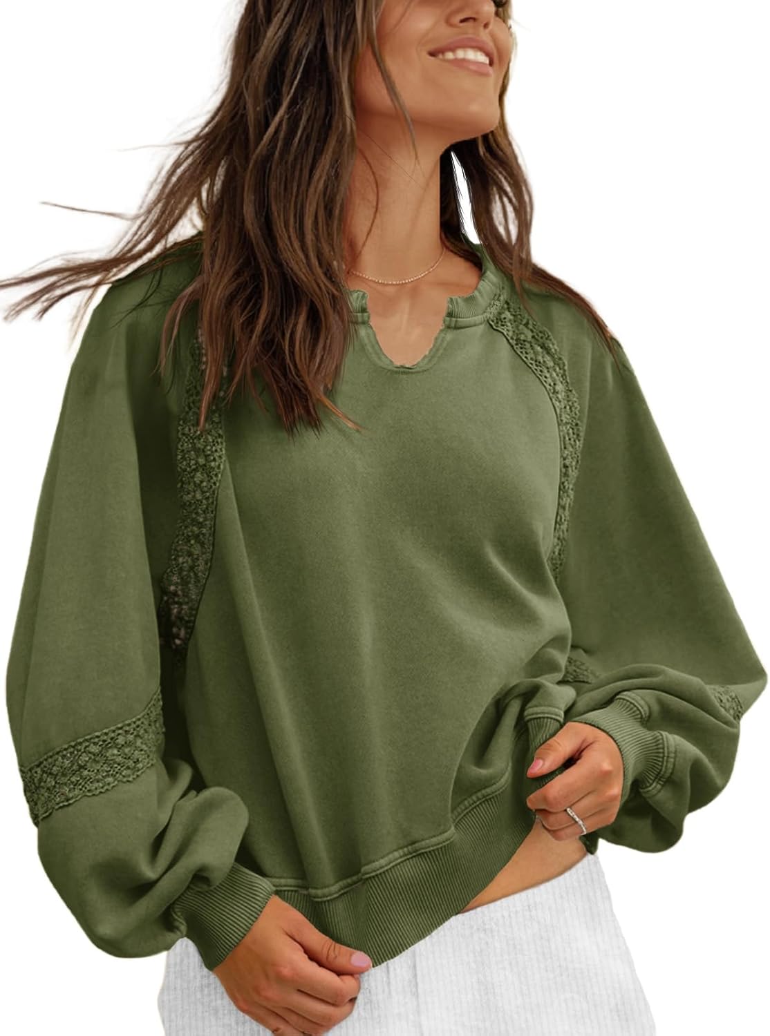 Fisoew Womens Oversized Sweatshirt Casual V Neck Lace Lantern Long Sleeve Cropped Loose Fit Fall Pullover Tops