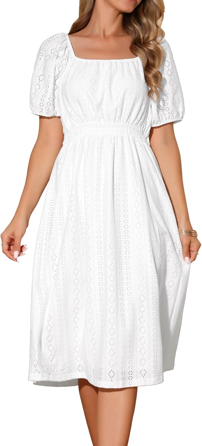 Seta T Women's Summer Eyelet Dresses Square Neck Short Sleeve Casual A Line Midi Dress