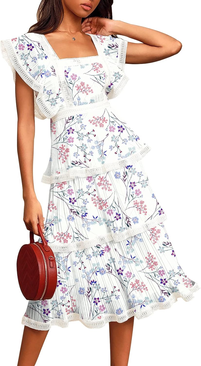 ETCYY Women's Summer Ruffle Dress Tiered Layed Chiffon Lace Short Sleeve Boho Floral Print Party Wedding Guest Maxi Dresses