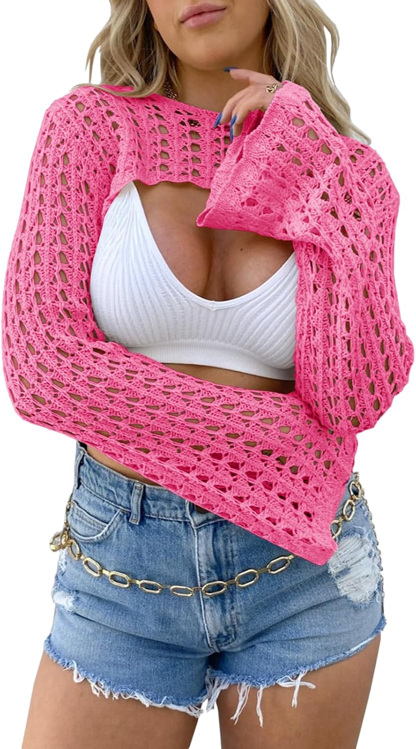 Langwyqu Women's Crochet Crop Tops Y2k Long Sleeve Crewneck Shrug Hollow Out Summer Beach Cover Ups