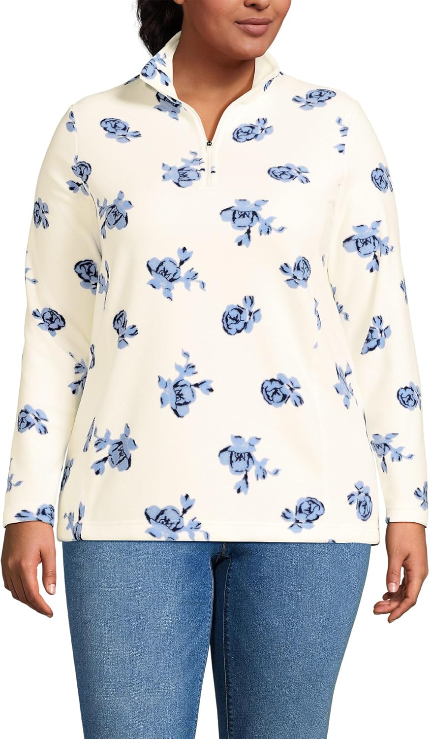 Lands' End Womens Anyweather Quarter Zip Fleece Pullover Print Ivory/Clear Blue Tossed Floral Plus 2X