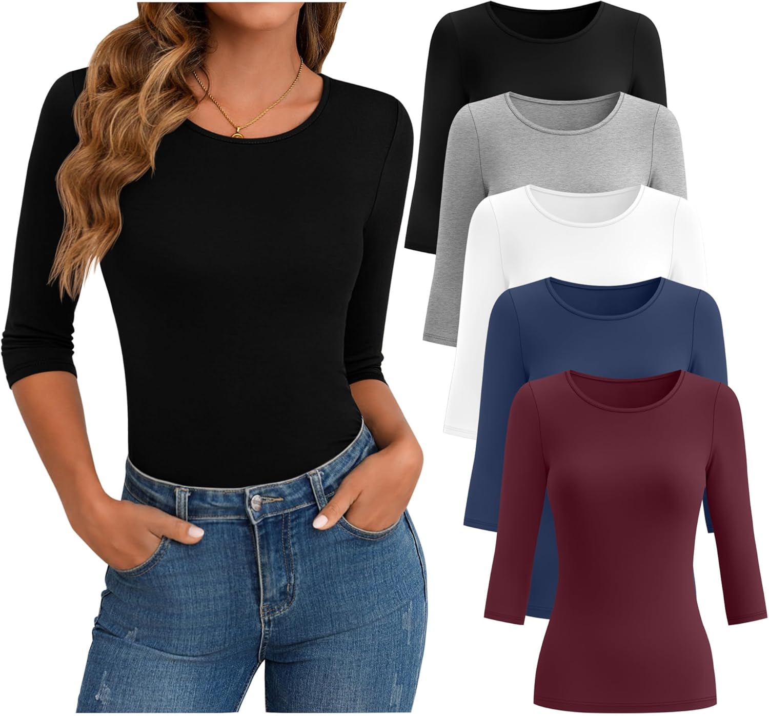 Huukeay 5 Pack Women's Elbow Sleeve Tops 3/4 Sleeve Round Neck T-Shirt Slim Fit Casual Stretchy Tunic Basic Tees Bulk