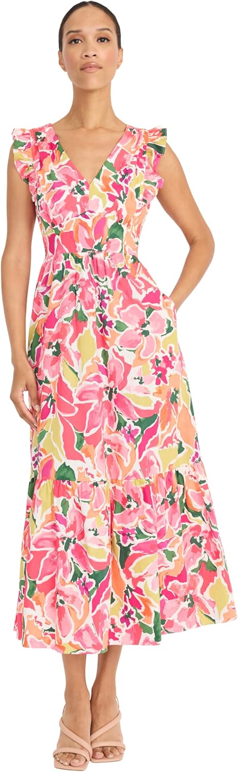 Maggy London Women's Ruffle V-Neck Tiered Midi Pockets-Lightweight Summer Fit and Flare Wedding Guest Dress