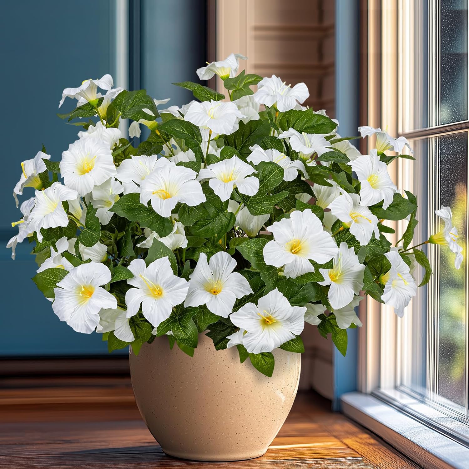 - Packing List: Artificial Outdoor Flowers Morning Glory 1 pack contains 4 pcs 19 Inch high Fake Flowers, each pcs includes Adjustable 7 flexible stems (Pot Not Included).