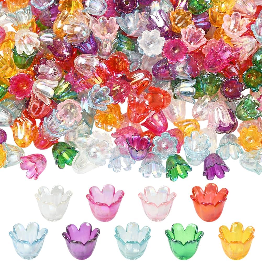 1 Box 540Pcs 9 Colors Acrylic Lily Flower Beads Floral Bead Caps Bulk Loose Small 11MM Plastic Cute Tulip Bell Trumpet Iridescent Spacer for Jewelry Making DIY Crafts Adults Women Beginner