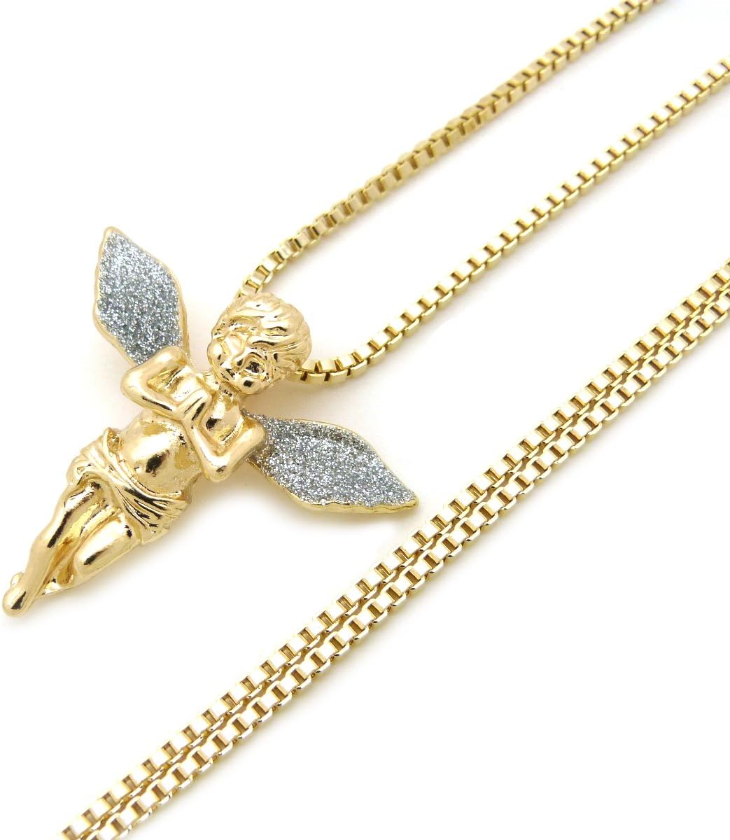 Fashion 21 Sparkled Micro Angel Cherub Pendant 2mm 24 inches Box Chain Necklace Gold Silver Tone