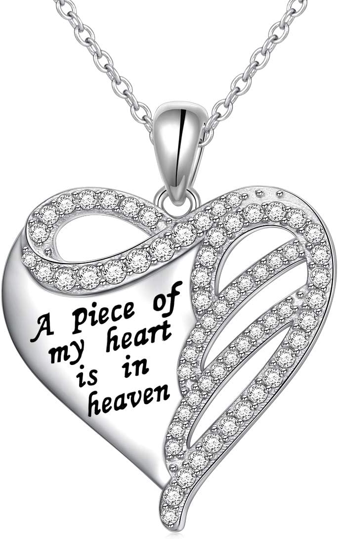 925 Sterling Silver Keepsake Memorial Necklace A Piece of My Heart is in Heaven Infinity Angel Wing Heart Pendant Necklace for Women Remembrance Sympathy Gift