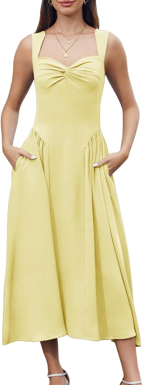 Women's Wedding Guest Dress Corset Sleeveless Semi Formal Bridesmaid Flowy Midi Dresses with Pockets