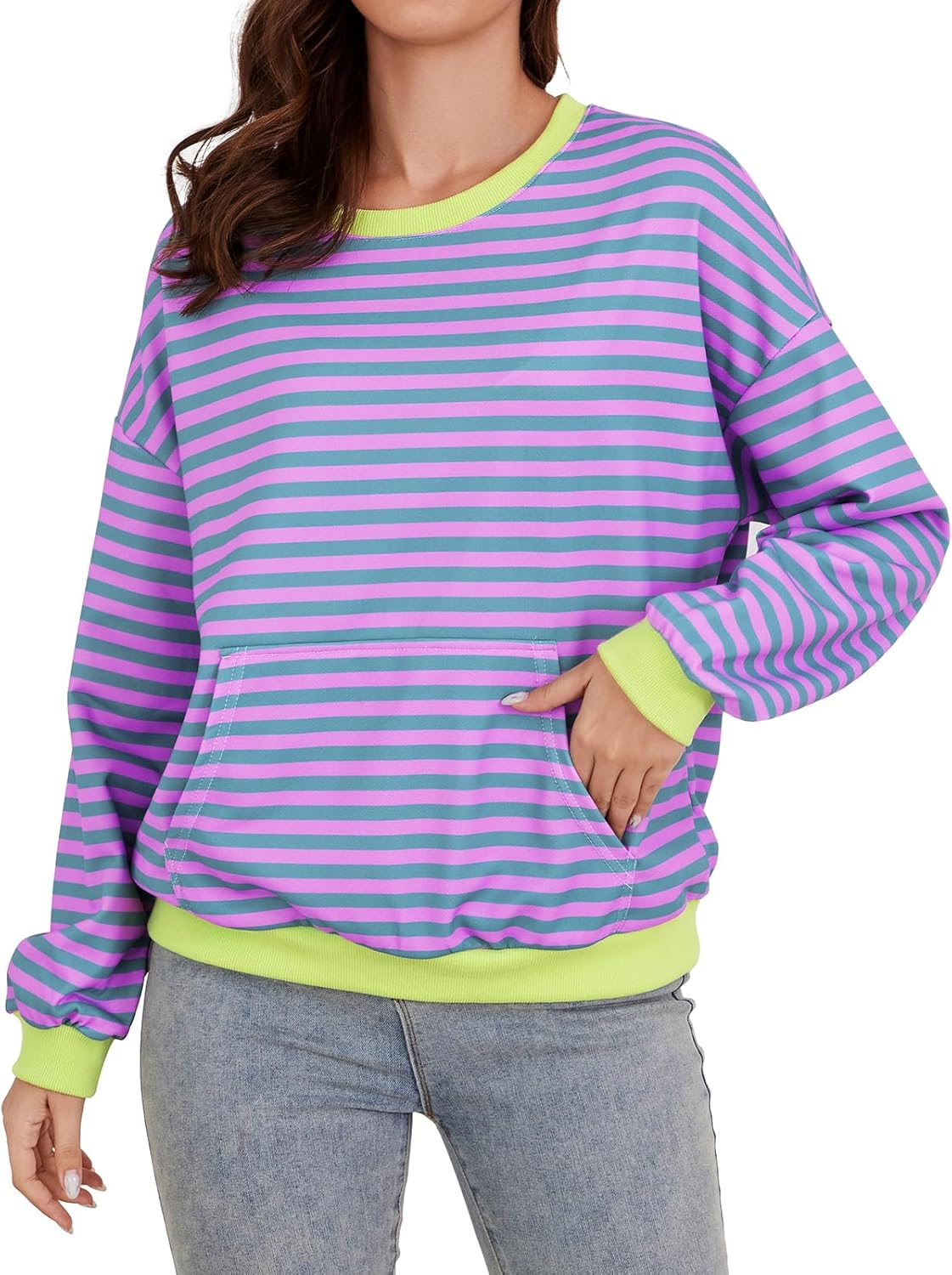 YATHON Womens Striped Sweatshirt Casual Long Sleeve Color Block Crew Neck Loose Pull Over Y2K Fall Tops with Pockets