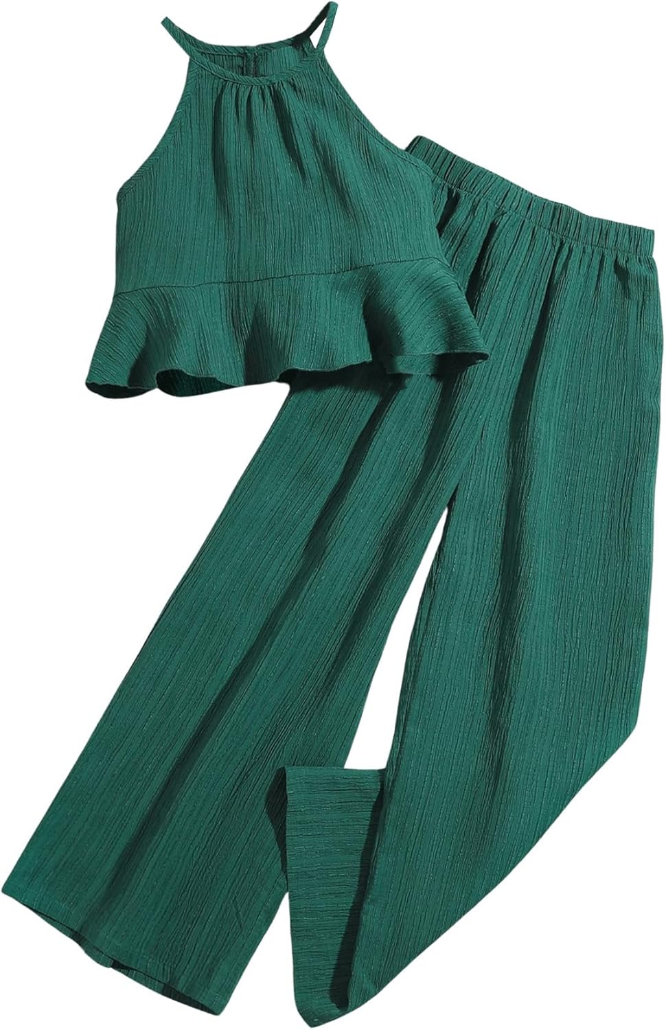 SweatyRocks Girl's 2 Piece Outfits Ruffle Halter Sleeveless Top and Elastic High Waisted Pants Set