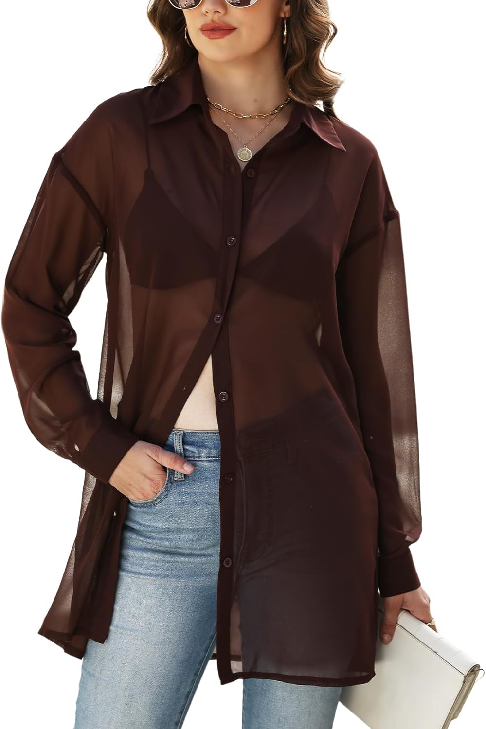 Gihuo Womens Sheer Blouse Mesh Button Down Shirts Long Sleeve Sexy See Through Tops