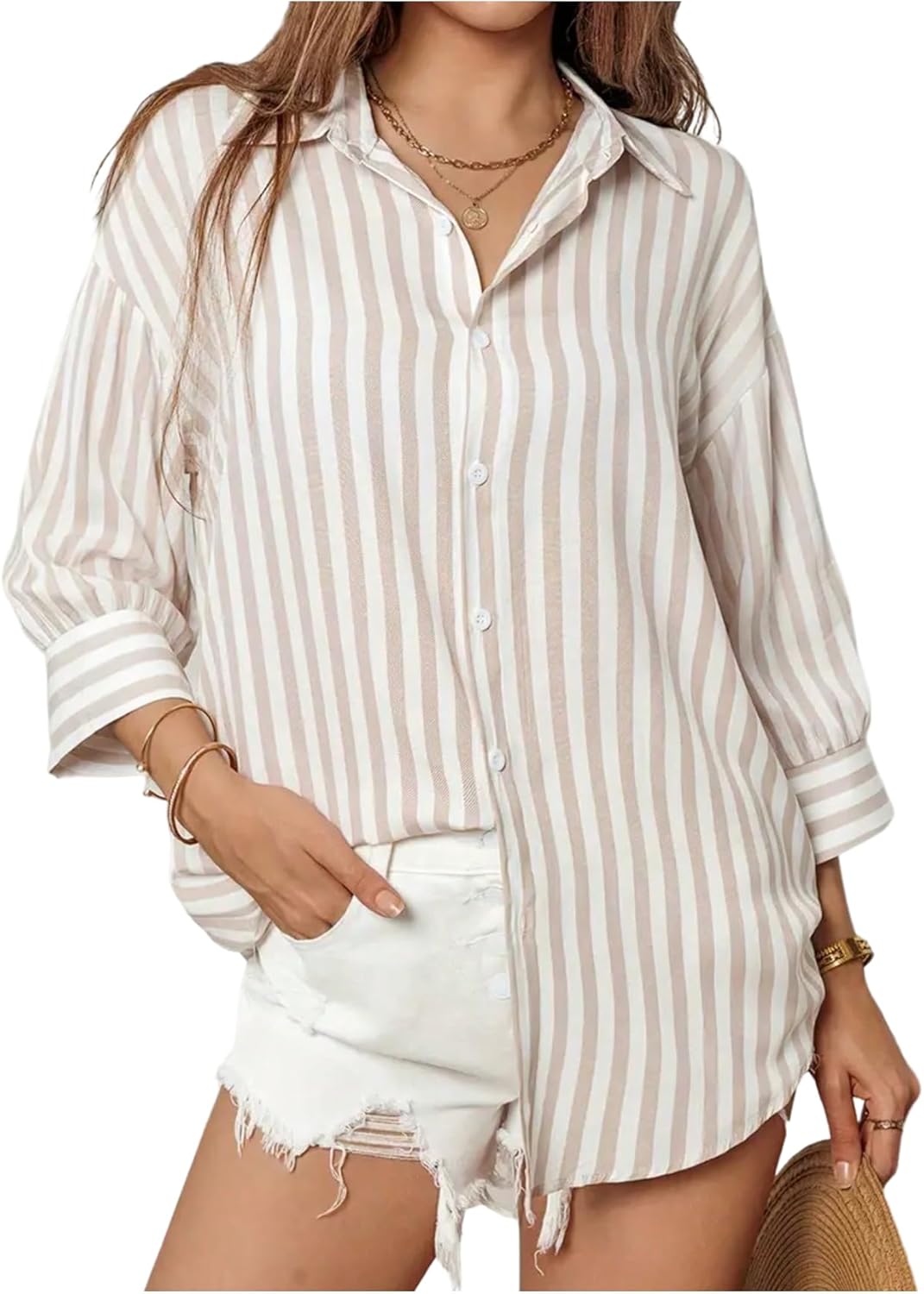 SOLY HUX Women's Striped Shirt Button Down Collared 3/4 Sleeve Casual Blouse Tops