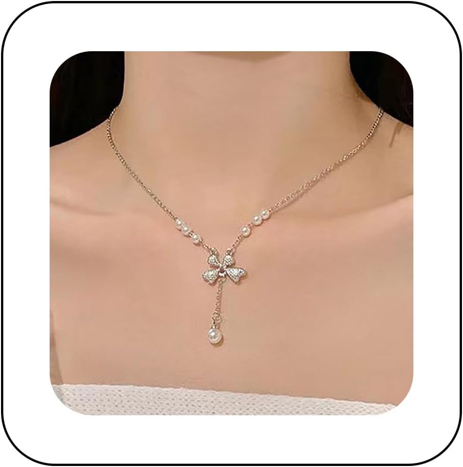 Bohemian Crystal Pearl Choker Necklace Silver Cz Bow Pendant Necklace Round Pearl Y Drop Necklace Rhinestone Bow Tie Chain Necklace Jewelry for Women Gifts