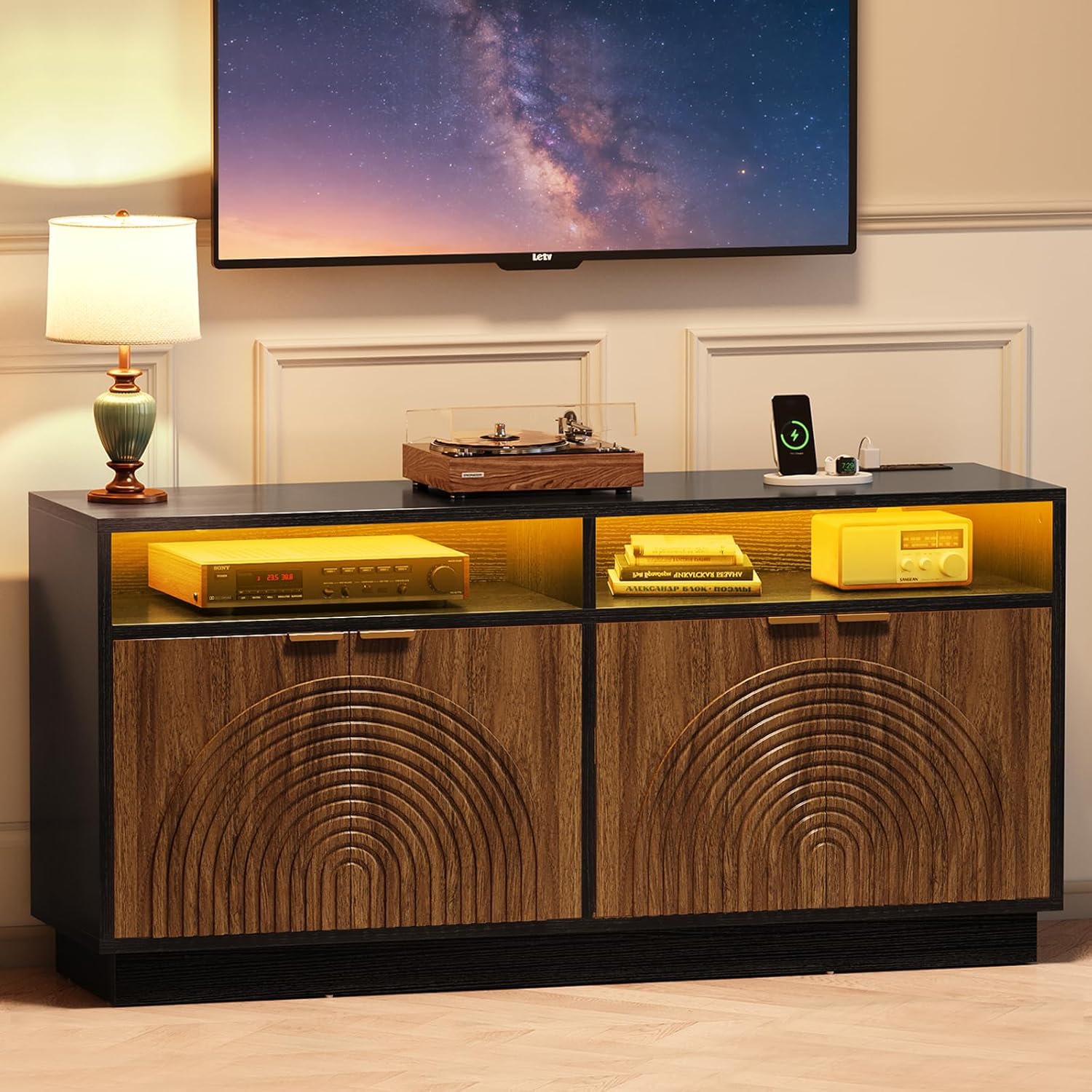 - 【Massive Flexible Storage Space】 Say goodbye to clutter: the top fits a soundbar; 2 open shelves hold routers or speakers; 2 cabinets store game consoles, books, and daily items. Inner shelves offer 3 adjustable heights, adapting to items of all sizes effortlessly