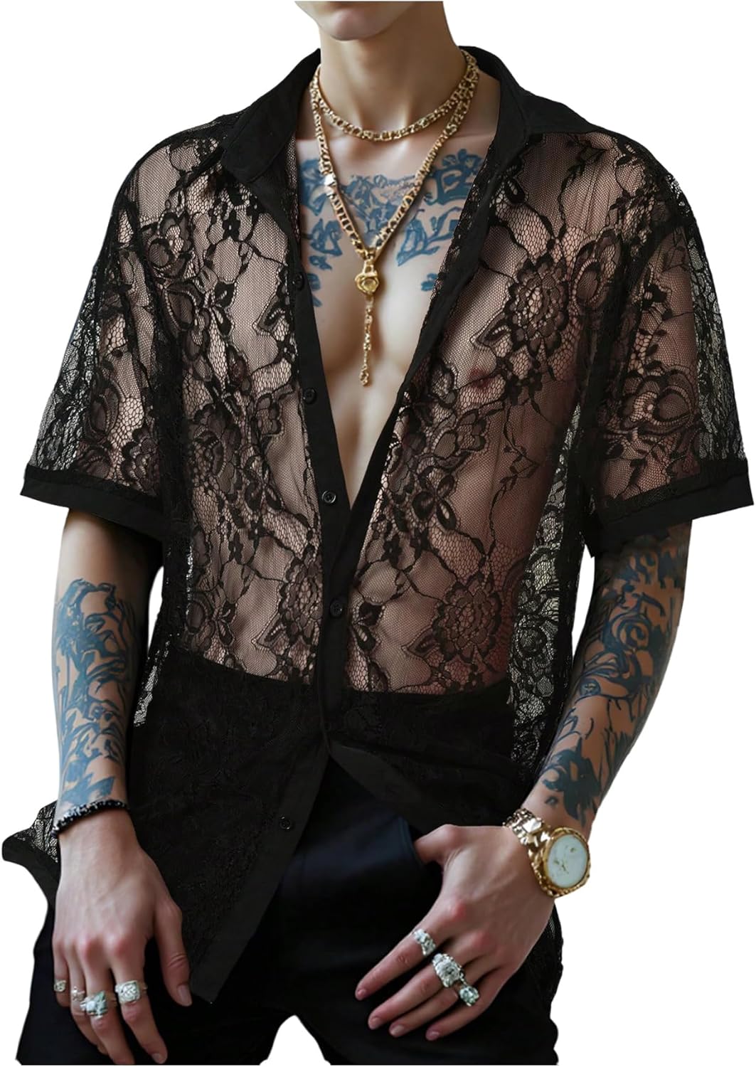 OYOANGLE Men's Floral Lace Sheer Button Up Shirt See Through Short Sleeve Collar Party Tops