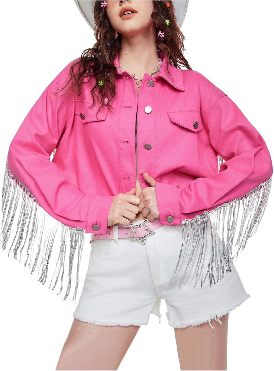 OYOANGLE Women's Y2K Sequin Stars Fringe Denim Jacket Long Sleeve Button Up Crop Jean Jackets