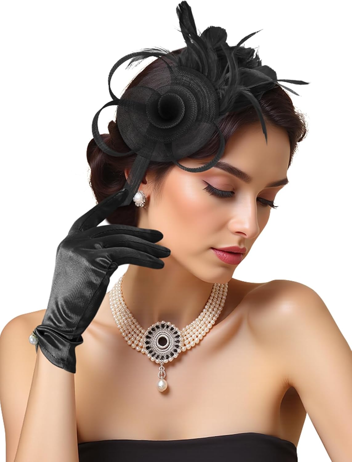 2Pcs 50s Fascinators Hats for Women Wedding Cocktail Flower Mesh Ribbons Feathers Church Tea Party Hats and Lace Glove