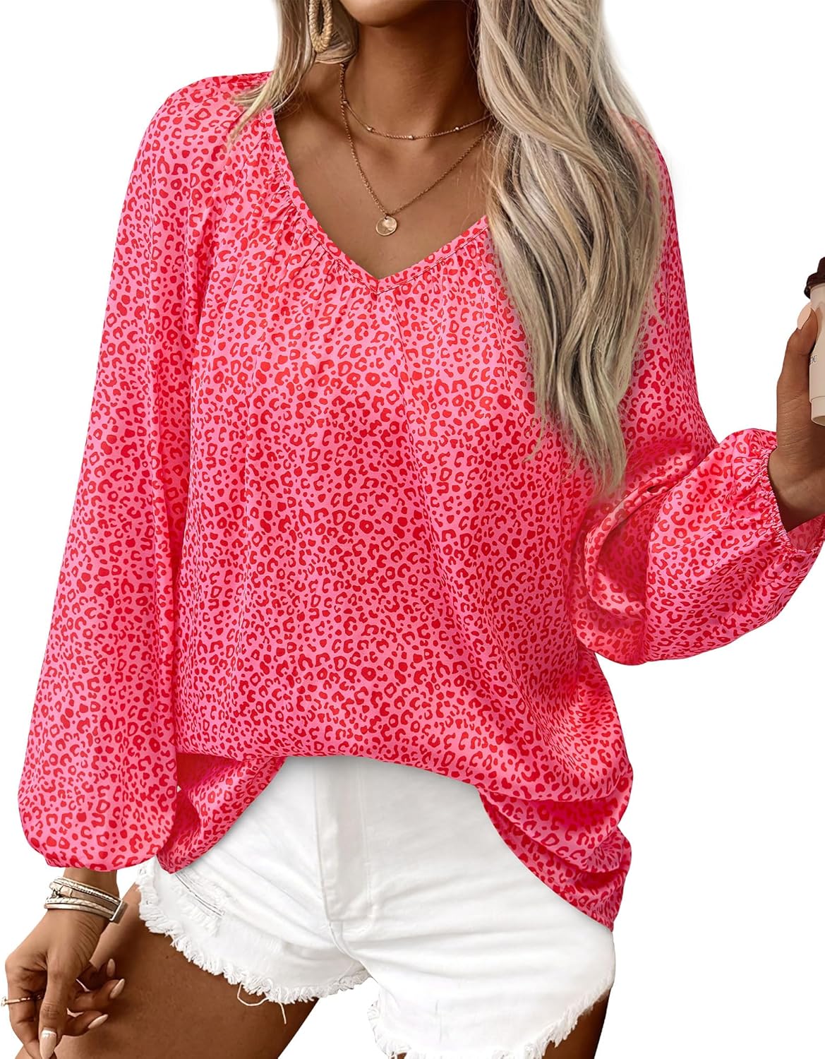 Zenlonr Women's Summer Tops Dressy Casual 2025 V Neck Satin Silk Printed Shirts Boho Long Sleeve Work Blouses(Pink Leopard,XX-Large)