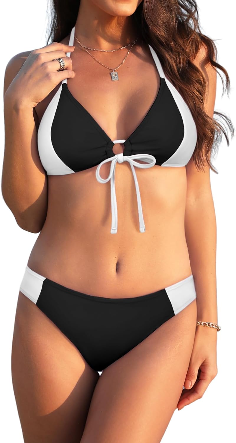 Women Bikini Set Bathing Suit Trendy Two Piece Push Up Color Block Swimsuit Sexy Adjustable Chest Tie Swimwear