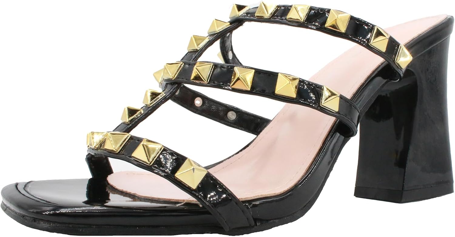 Women'S Leather T-Strap Strappy Studded Chunky Heel Slide Sandals Fashion Multi Band Square Toe Open Slip On Comfort Block High Heel Slingback Mule Slipper For Beach Prom Party Wedding Dress