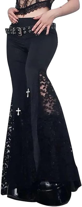 Women's Gothic Lace Flared Pants Wide Leg Palazzo Pants High Waist Mesh Bell Bottom Trousers for Party Festival Dance