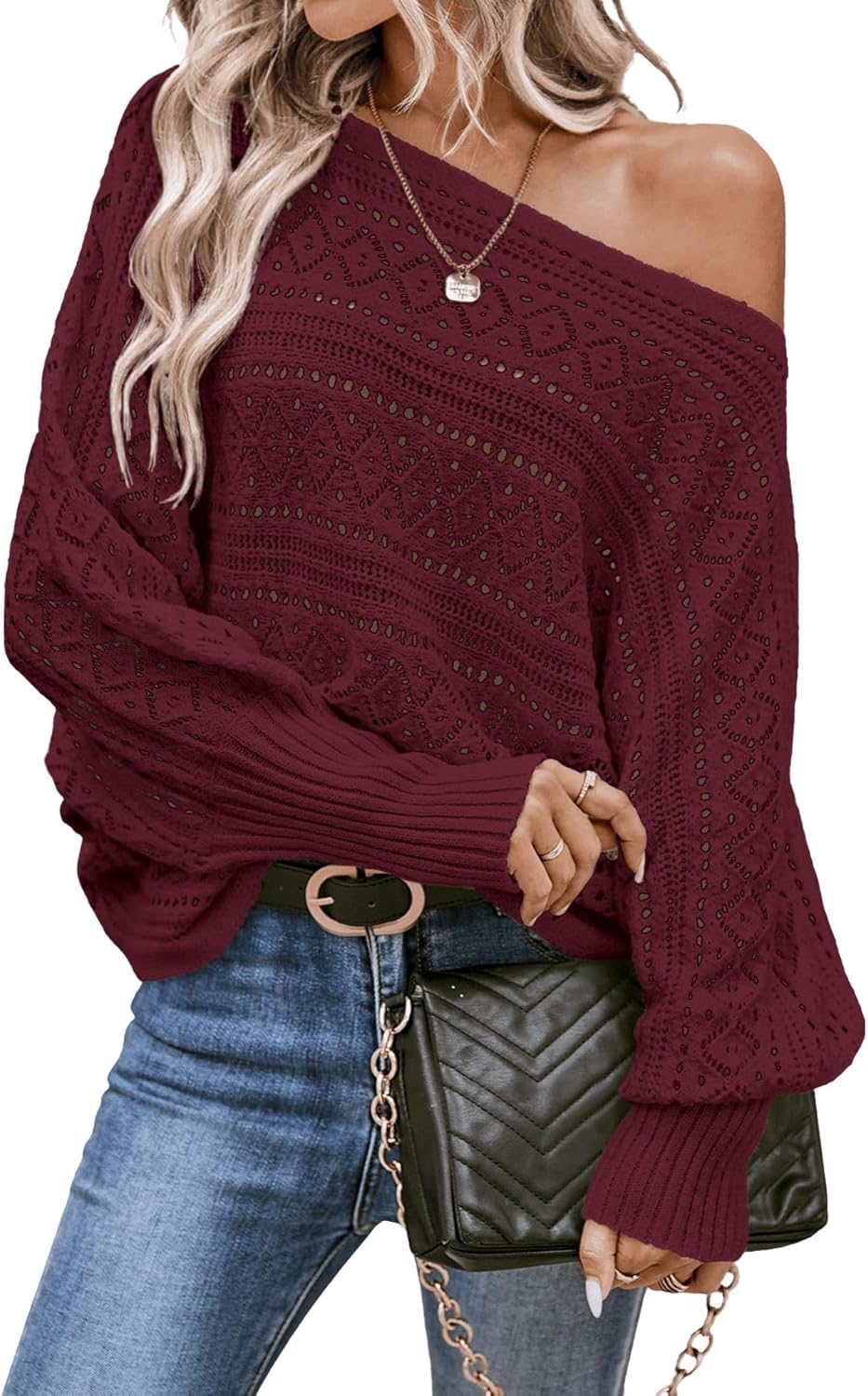 Verdusa Women's 2026 Off The Shoulder Sweater Crochet Dolman Sleeve Oversized Boat Neck Long Sleeve Pullovers