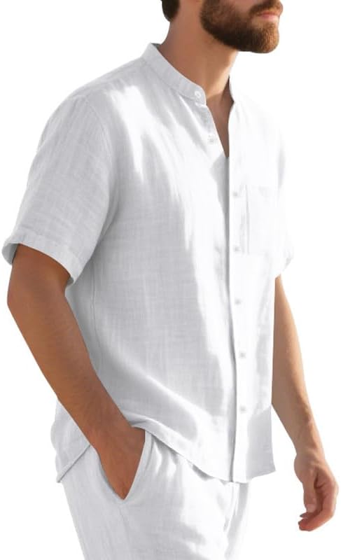 Men's Cotton-Linen Shirt - Short Sleeve Button Down Breathable Business Casual Shirt with Pocket for Vacations