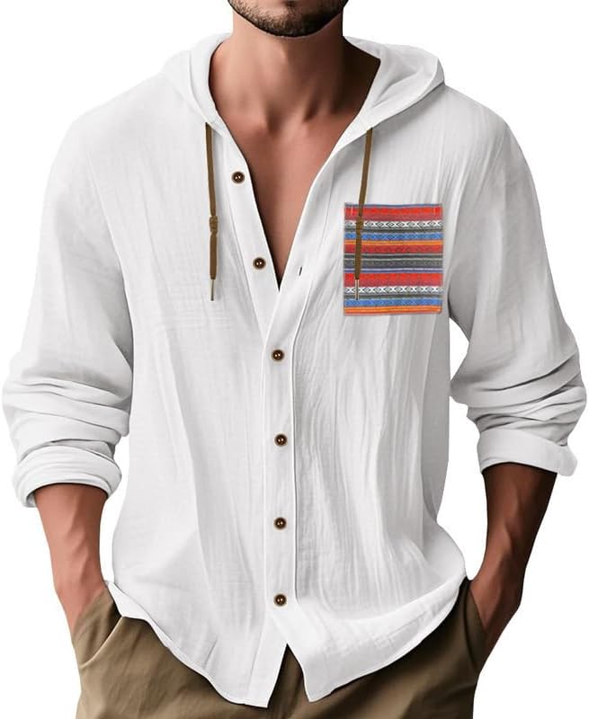 Men's Cotton-Linen Shirt - Long Sleeve Button-Up Hooded Shirt with Pockets Casual Wear for Vacations Daily Use