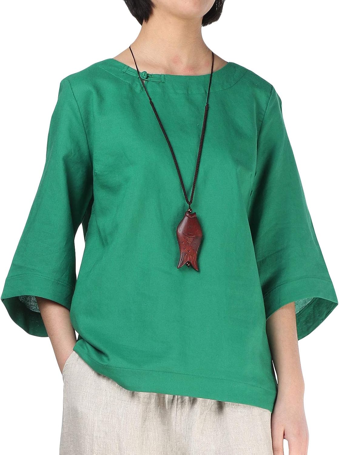 Minibee Women's Linen Blouse Round Neck 3/4 Sleeve Shirt Tops with Chinese Frog Button