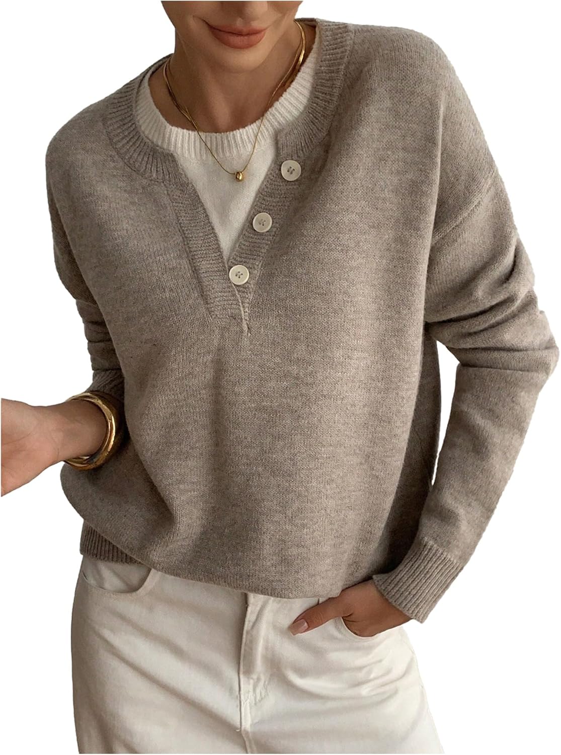 GORGLITTER Women's Button Up V Neck Sweater Cozy Fall Fashion Color Block 2 in 1 Long Sleeve Trendy Pullover Tops