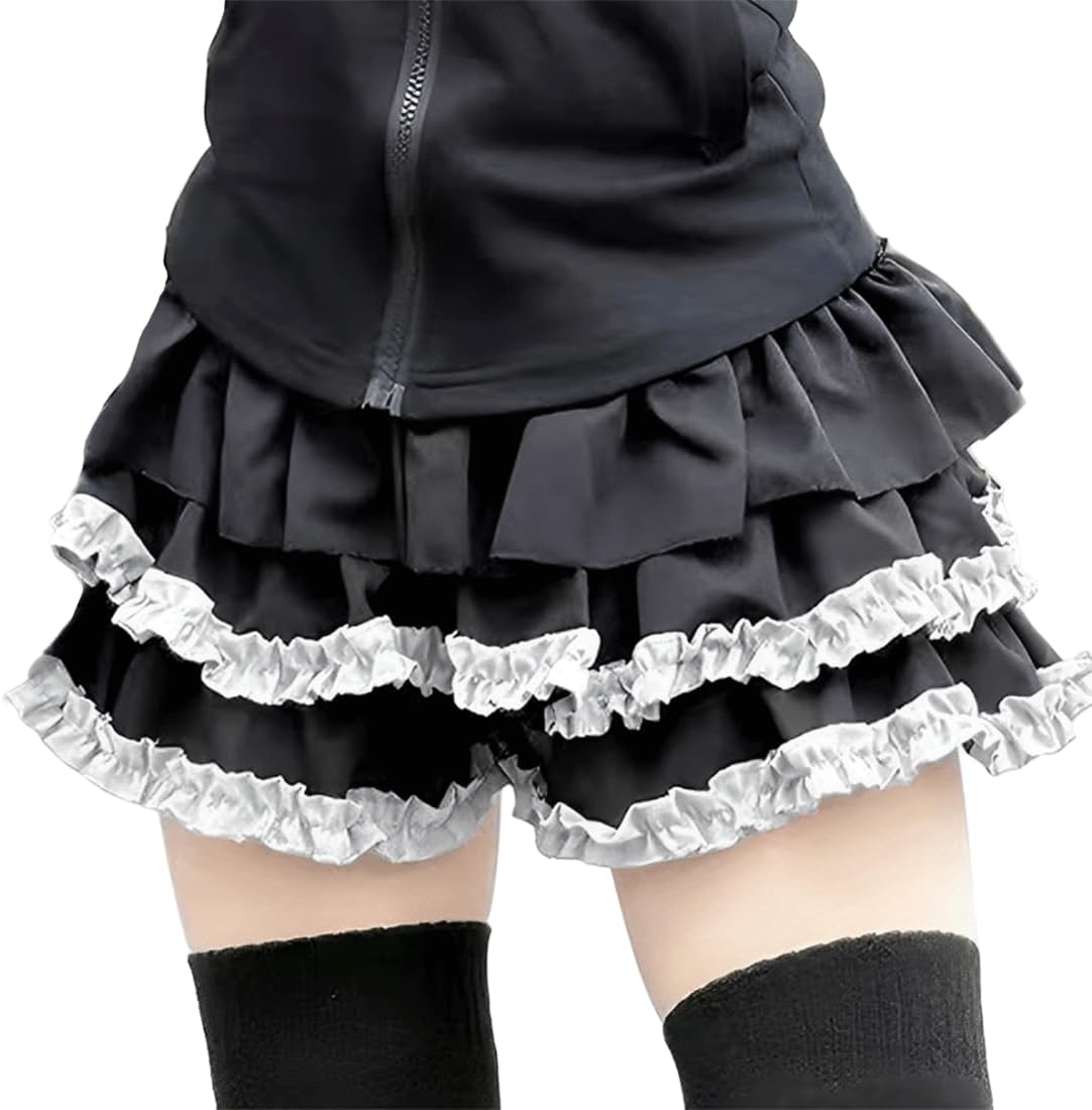 Lolita Kawaii Gothic Casual Style Elastic Waist Vintage Layered Lace Hem Ruffle Short Skirt with Underneath