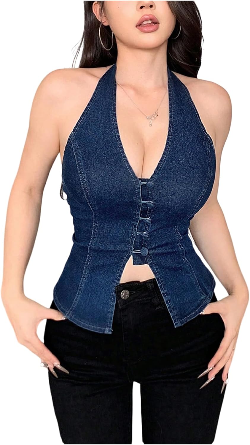 OYOANGLE Women's Sleeveless Halter Denim Top Backless Slit Hem Fitted Y2K Jean Tank Tops