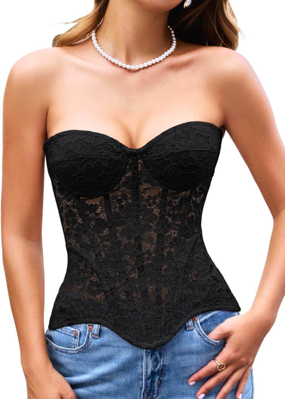 Women's French Romance Corsets, Sheer Floral Lace Fits 0-18, Push-Up Bustier with Boning and Adjustable Lacing