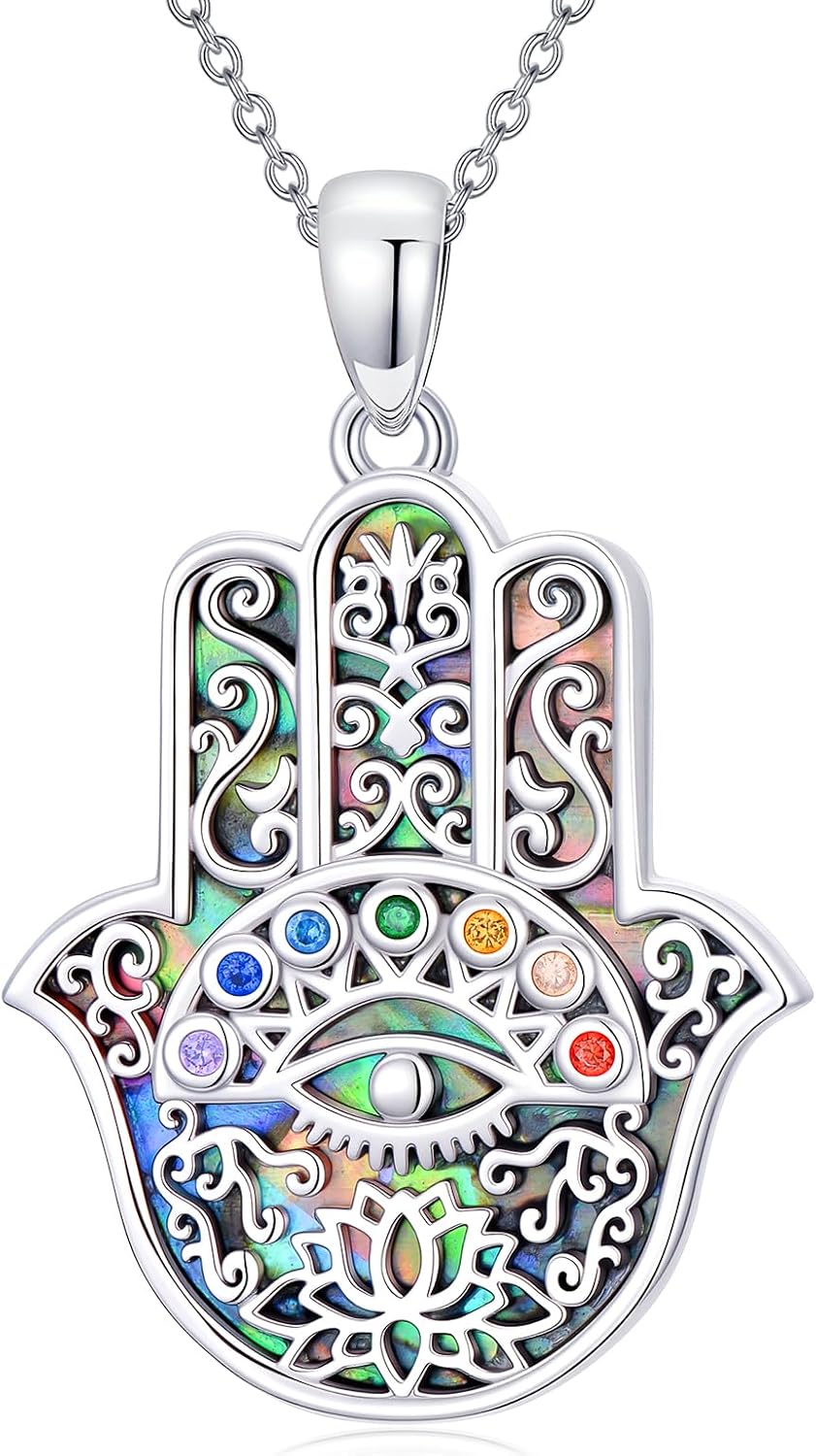 Chakra Hamsa Necklace 925 Sterling Silver Evil Eye/Scarab Hamsa Hand Pendant Lotus Fatima Jewelry for Women