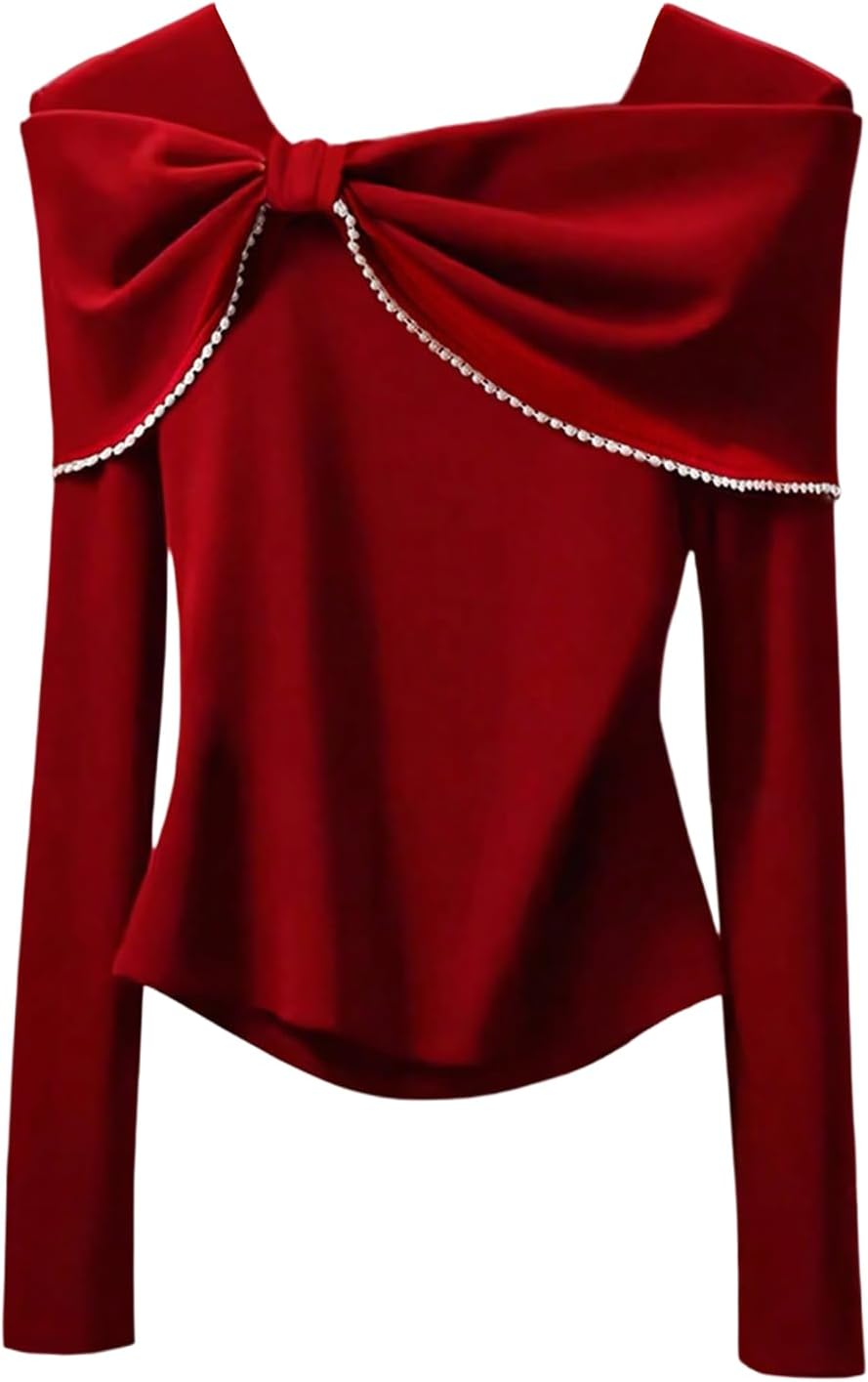 Verdusa Women's Bowknot Fitted T Shirts Long Sleeve Foldover Dressy Tops Elegant Outfits