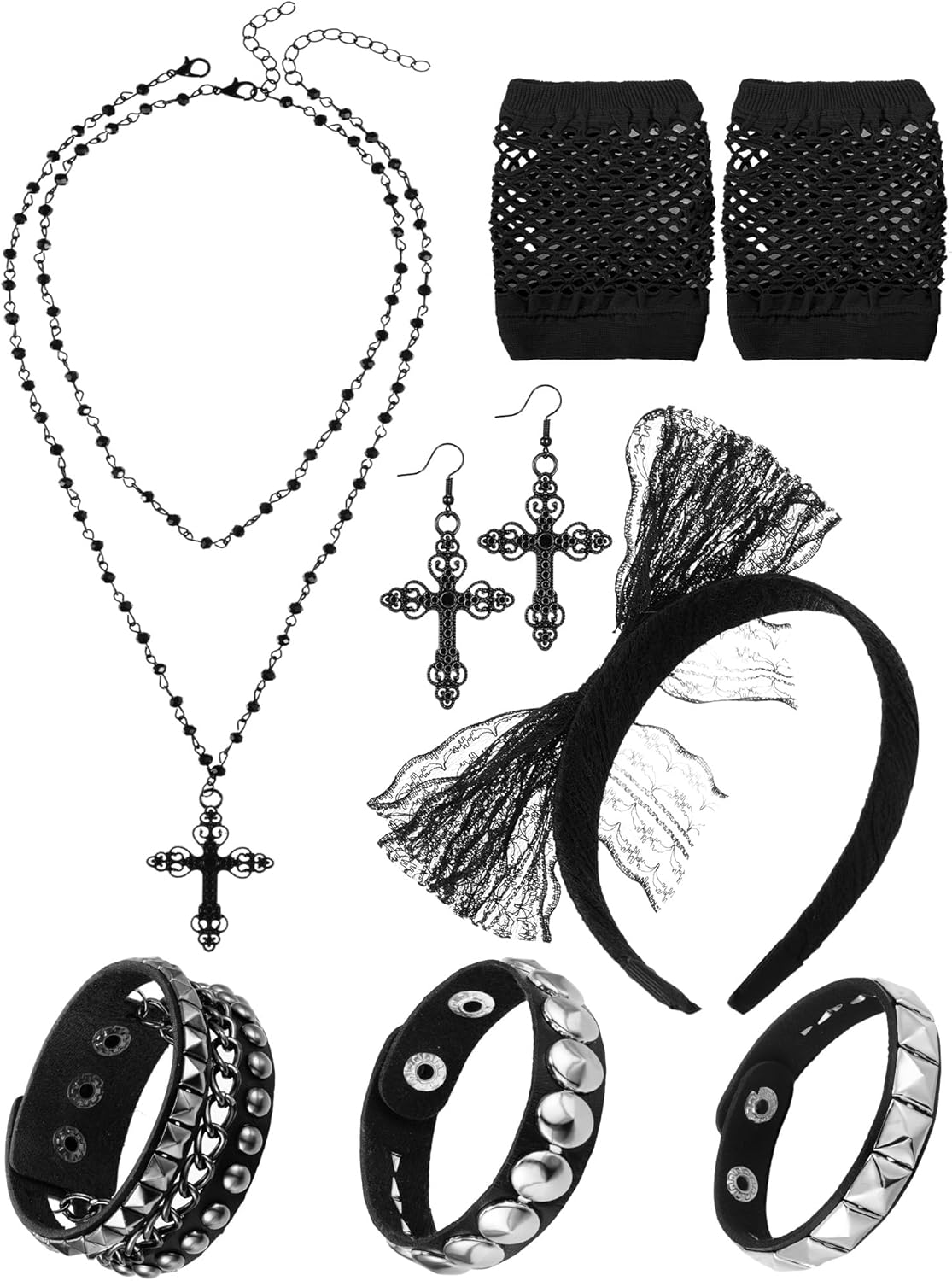 7 Pcs 80s Women Costume Accessories Halloween Leather Punk Bracelet Black Cross Necklace Lace Headband Fishnet Glove