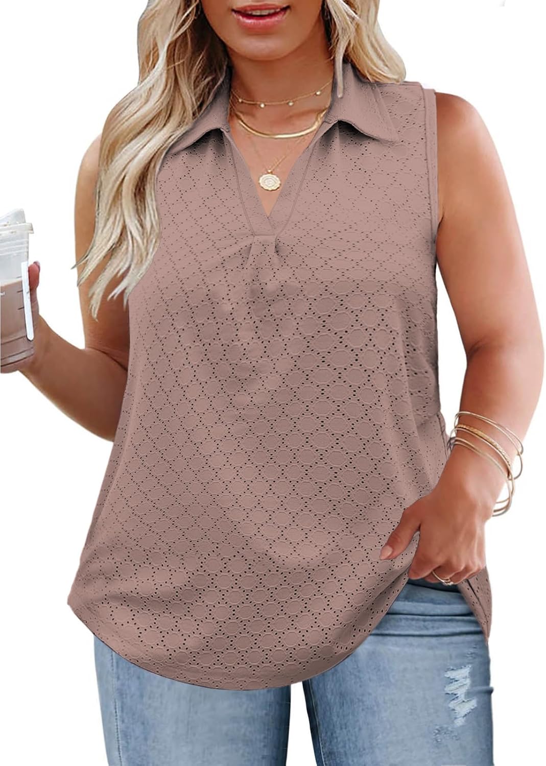 ROSRISS Womens Plus-Size-Tank-Tops Summer Sleeveless Casual Shirts Lapel V Neck Tunics Eyelet Tees
