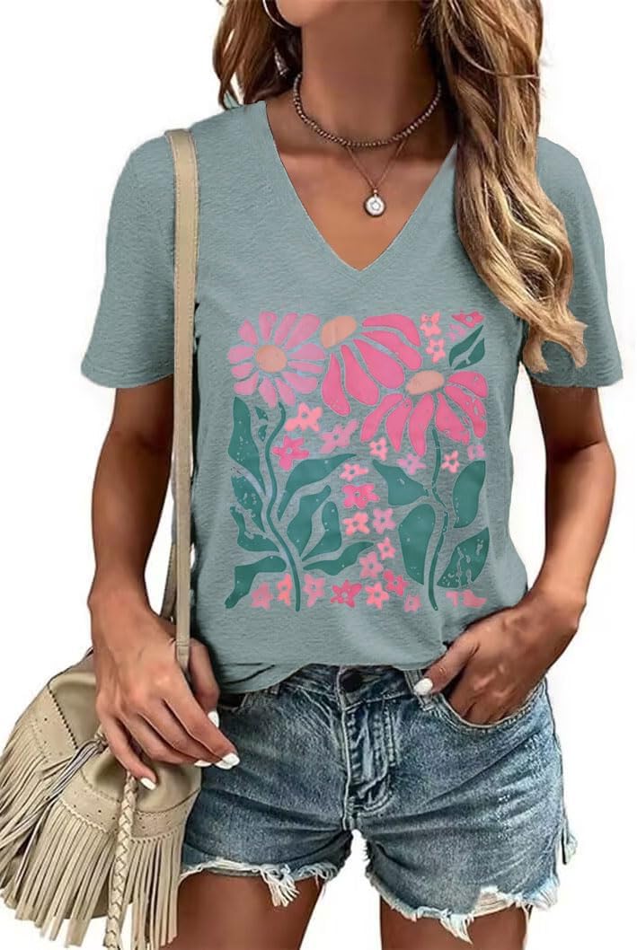 Women's T-Shirts V-Neck Flowers Tee Funny Summer Vacations Beaches Graphic Shirts Short Sleeve T Shirt
