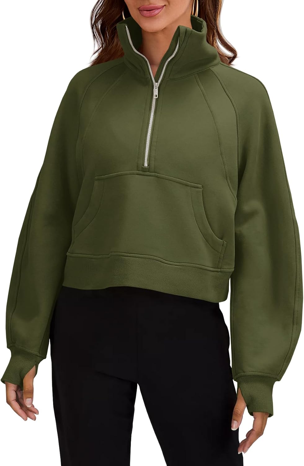 Womens Sweatshirts Half Zipper Crop Pullover Funnel Neck Fleece Lined Zip Up Long Sleeve Tops Thumb Hole Army Green