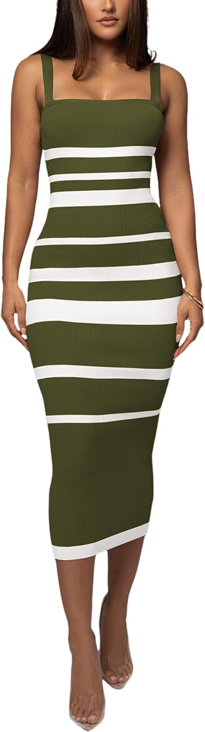 Women's Casual Striped Sleeveless Ribbed Knit Square Neck Summer Bodycon Tank Midi Dresses